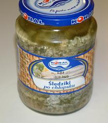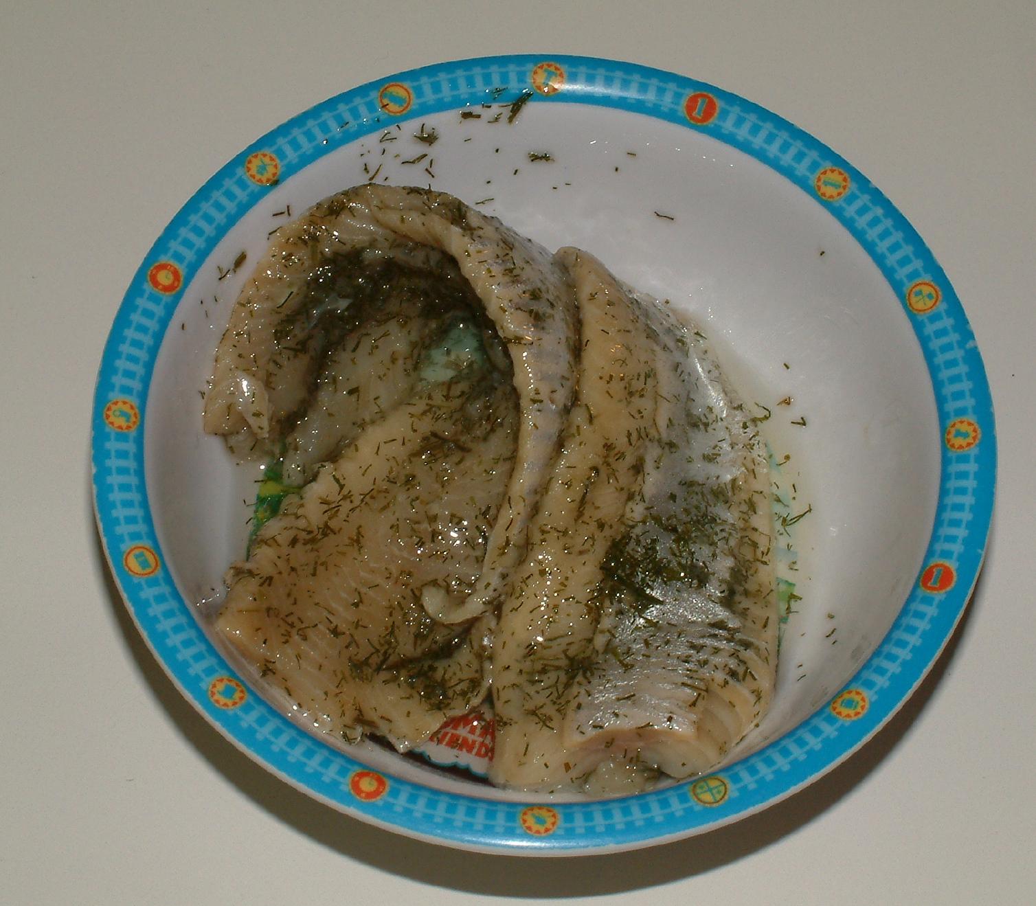 This is herring in oil that I bought at a store called BOBAK. It is actually very tasty and the green color comes from finely chopped dill.